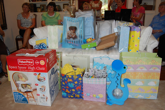 To highlight some unique gifts, mom made a sweater and matching cap. It also came with a knitted bunny! Too cute. She also made him a nice blanket with fun colors (other than blue). I got 2 other knitted blankets, and a set of blankets and clothes with "Little Mann" embroidered on it. Thumper got lots of clothes and mommy got some moola to spend! Grandmama Debora got him a cute dino bank...and we no how I love dinos! Catherine mailed in some cute dino hooded towels and washclothes too!
